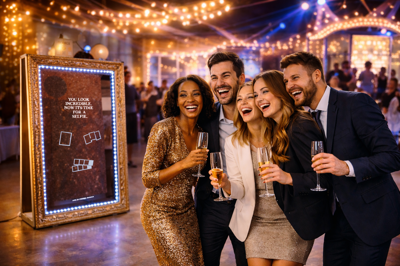 Der Fotospiegel kombiniert modernes Design mit interaktiver Technik und ist ein echtes Statement auf hochwertigen Events. Besonders beliebt bei Hochzeiten, Gala-Abenden und exklusiven Firmenfeiern.